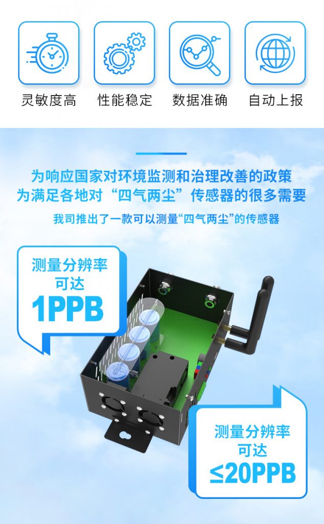 在線四氣兩塵傳感器是精訊暢通為滿足各地對四氣兩塵傳感器的很多需求,推出了一款可以測量四氣兩塵的傳感器。在線四氣兩塵傳感器可以實時測量大氣環境中的PM2.5、PM10、二氧化硫、氮氧化物、臭氧、一氧化碳的濃度。該空氣質量傳感器廣泛適用于校園、森林、大氣、公園、機場、農業等環境的空氣質量監測。