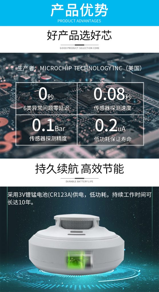 采用3V鋰錳電池(CR123A)供電,低功耗,持續工作時間可長達10年。