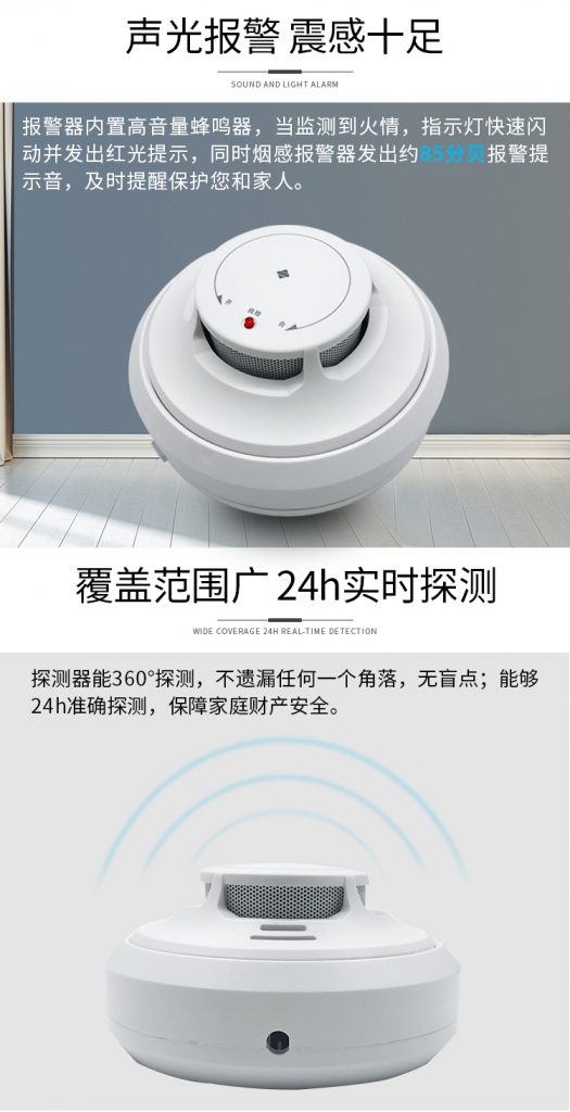 報警器內置高音量蜂鳴器,當監測到火情,指示燈快速閃動并發出紅光提示,同時煙感報警器發出約85分貝報警提示音,及時提醒保護您和家人。
