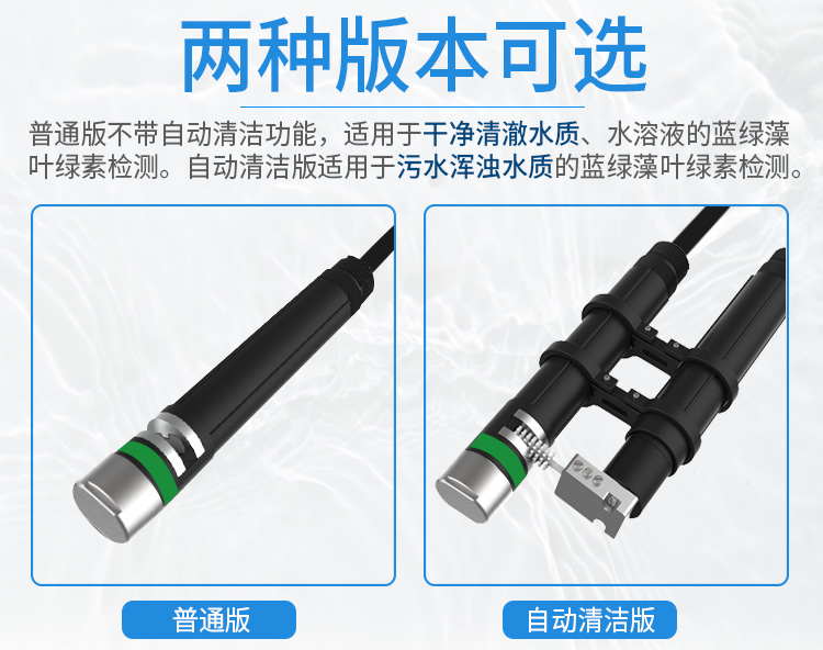 ?葉綠素/藍綠藻分析儀能夠用于檢測自來水、水源地、觀景水等各種水體中的藍藻葉綠素濃度及總葉綠素濃度。葉綠素/藍綠藻水質檢測儀分析快速、操作簡便、測量準確度高,能夠實現水質實時監測。葉綠素/藍綠水質檢測儀無需制備樣品,直接浸入水中即可進行在線監測。葉綠素/藍綠藻水質檢測儀有兩種版本的檢測儀供選擇。普通版不帶自動清潔功能,適用于干凈清澈水質、水溶液的藍綠藻、葉綠素檢測。自動清潔版適用于污水渾濁水質的藍綠藻葉綠素檢測。
