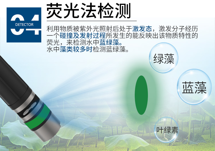5、熒光法檢測:利用物質被紫外光照射后處于激發態,激發分子經歷一個碰撞及發射過程所發生的能反映出該物質特性的熒光,來檢測水中藍綠藻。水中藻類較多時檢測藍綠藻。