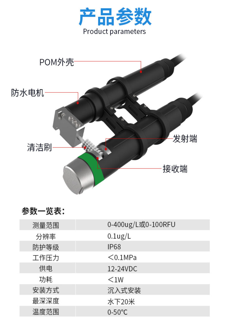 3、POM探頭:葉綠素/藍綠藻水質檢測儀采用鋁質外殼,無懼惡劣環境測量準確溫度。