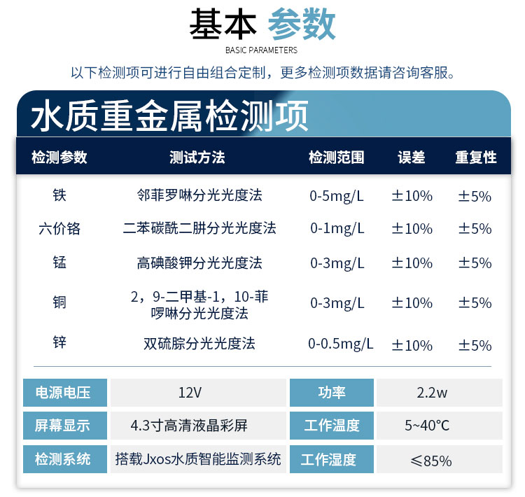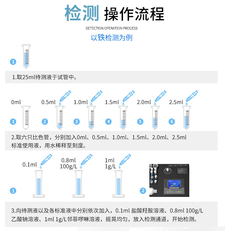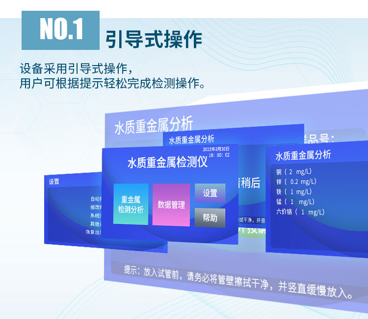 智能便攜式水質重金屬檢測儀是精訊暢通采用進口高精度光源和光電比色法來檢測水中重金屬含量的一款水質監測設備。智能便攜式水質重金屬檢測儀可檢測水中鐵、六價鉻、錳、銅、鋅等重金屬離子的含量,采用引導式操作,為用戶配套與預制試劑,能夠簡單完成檢測操作。可廣泛應用于企業污水、生活污水、地表水、科研院所、造紙印刷、冶煉鋼鐵等領域的水中重金屬檢測。
