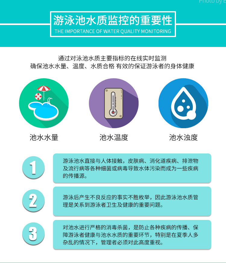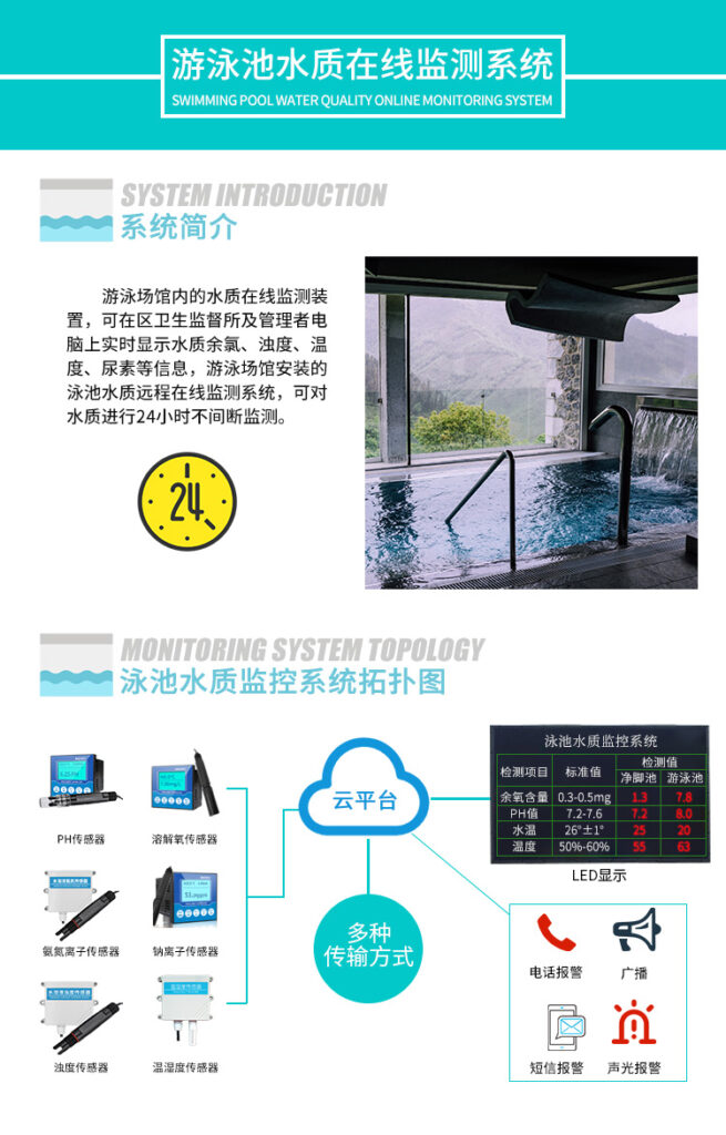 游泳池水質在線監測系統是由在線監測設備(遠程在線監測儀)與網絡監控平臺(數據中心) 組成,游泳池在線監測儀是水質監測的設備,主要功能是實時監測泳池水質余氯、pH、 溫度、濁度、0RP指標,數據自動采集、無線傳輸、云端存儲及分析處理、微信查看及預警、控制投藥、數據公示等優勢,實現泳池水質自動管理系統,維護水質達標。 游泳池水質在線監測系統能做到24小時實時監測水質重要指標,對可能發生的突發、異常情況及時給予預警,完成目前人工所不能完成的工作,不同的監測系統所監測的項目指標也有不同,游泳池在線監測儀能夠實時監測余氯、pH、濁度、溫度、0RP(氧化還原電位)等多個水質參數。